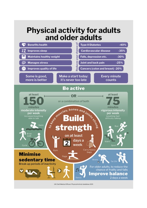 These could include heavy gardening, carrying heavy shopping, or resistance exercise. Muscle strengthening activities should be done on at least two days a week, but any strengthening activity is better than none.